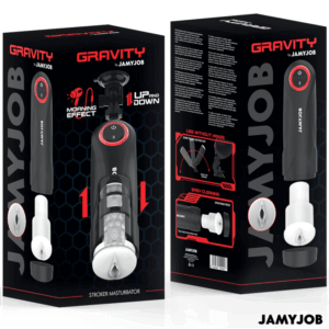 El masturbador automático para hombre GRAVITY de la marca JAMYJOB es un dispositivo innovador y elegante, diseñado para proporcionar una experiencia estimulante y placentera de alta calidad. Con un diseño en color negro que destaca por sus detalles en rojo, este masturbador combina estética y funcionalidad en un solo producto.