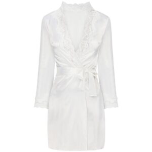 Un conjunto de ropa interior excepcionalmente hermoso hecho de satén crudo brillante, una bata de baño con camisola que llega hasta la mitad del muslo. La parte delantera y las mangas largas de la bata, atadas a la cintura con un cinturón, están decoradas con un bonito encaje. Camiseta de tirantes finos ajustables, decorada con el mismo encaje en el busto. Tanga incluida.