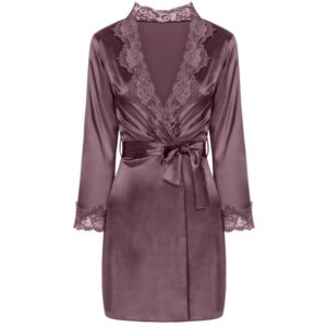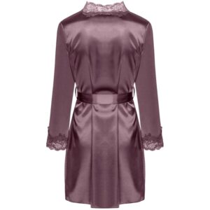 Un conjunto de ropa interior excepcionalmente hermoso hecho de satén violeta brillante, una bata de baño con una camisola que llega hasta la mitad del muslo. La parte delantera y las mangas largas de la bata, atadas a la cintura con un cinturón, están decoradas con un bonito encaje. Camiseta de tirantes finos ajustables, decorada con el mismo encaje en el busto. Tanga incluida.