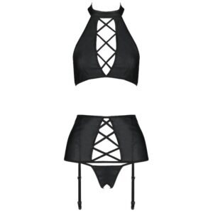 El conjunto Nancy es un conjunto de tres piezas de Passion, que incluye una parte superior sujeta al cuello, liguero y tanga cortado con audacia. Todo esto está hecho de cuero negro, que está decorado con numerosas rayas cruzadas que revelan las cualidades femeninas.