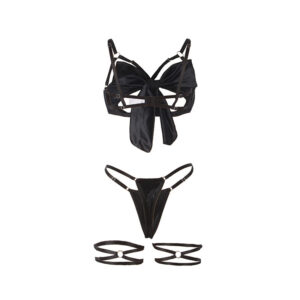 El tanga, minimalista y atrevido, complementa el diseño del sujetador, mientras que el liguero añade un toque irresistible de sofisticación. Este detalle adicional permite combinarlo con medias para completar un look audaz y provocador, ideal para momentos de intimidad o para sorprender con un estilo impecable.